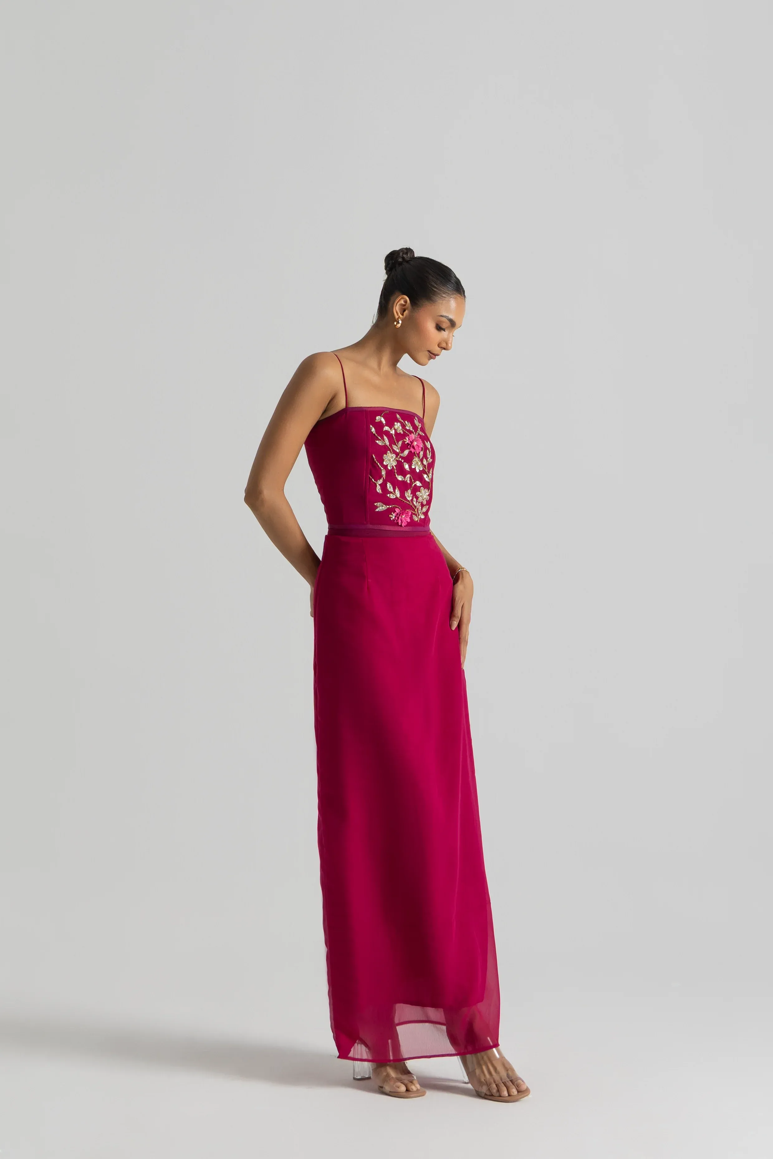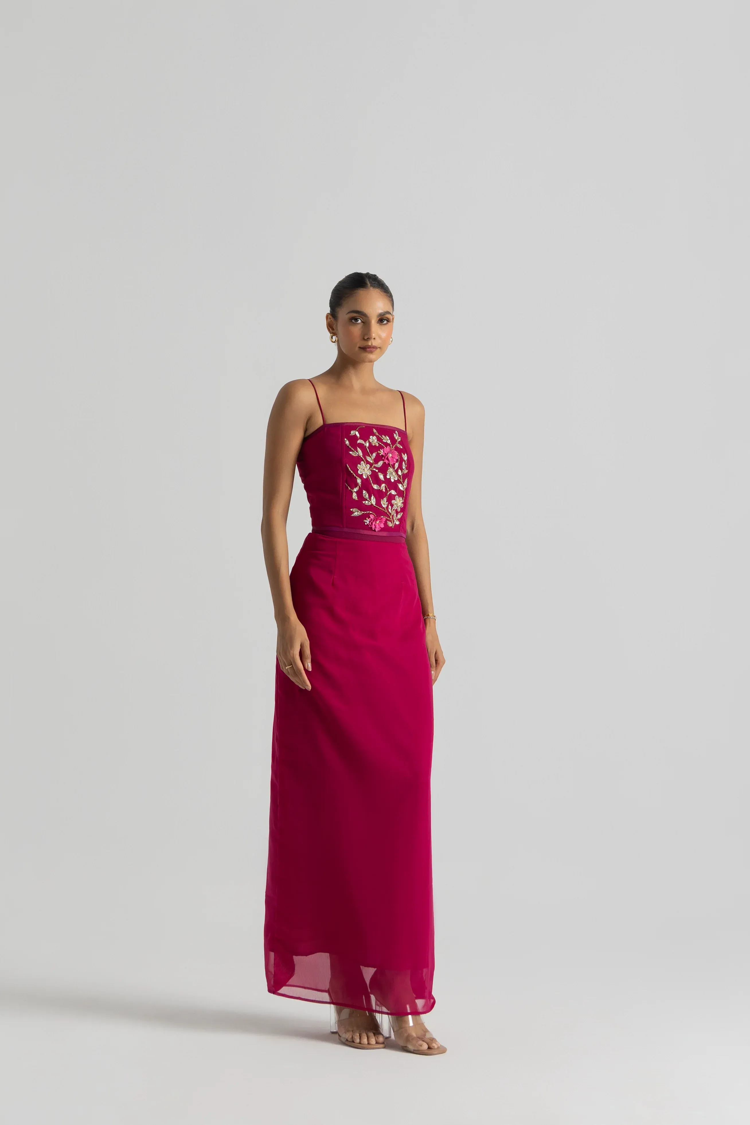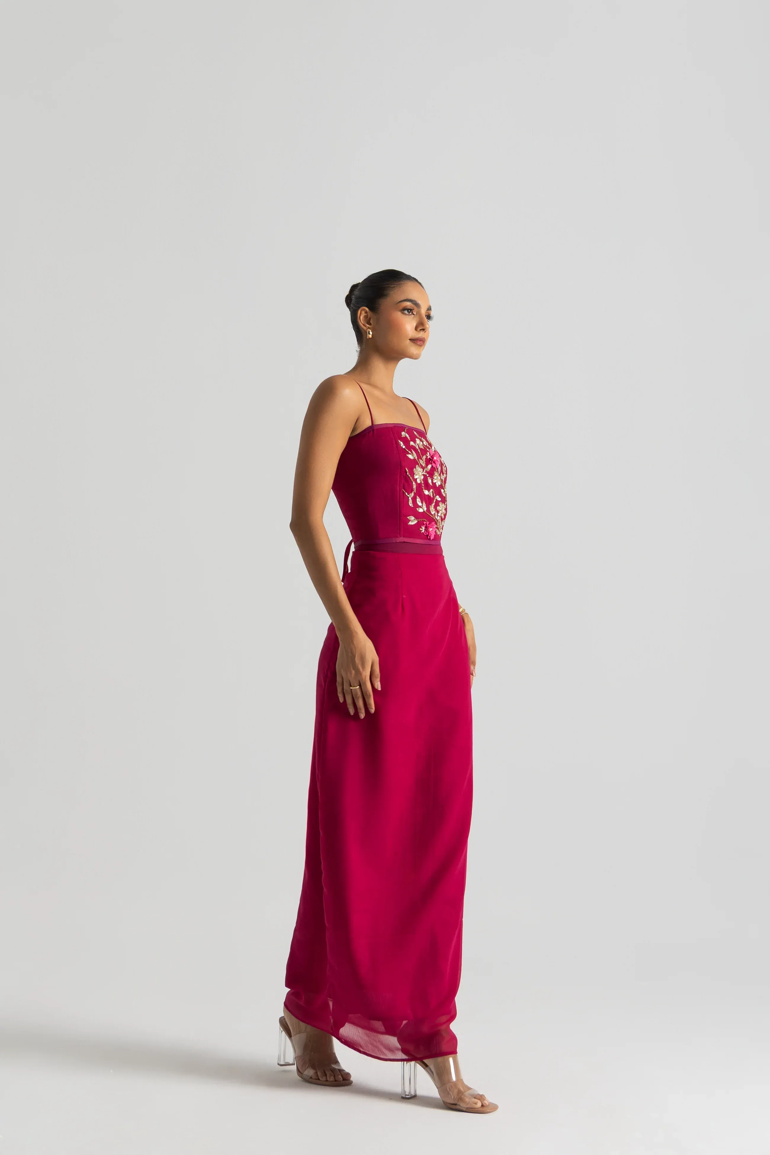 Three-piece set with embroidered bustier, pre-draped skirt and pallu; georgette.