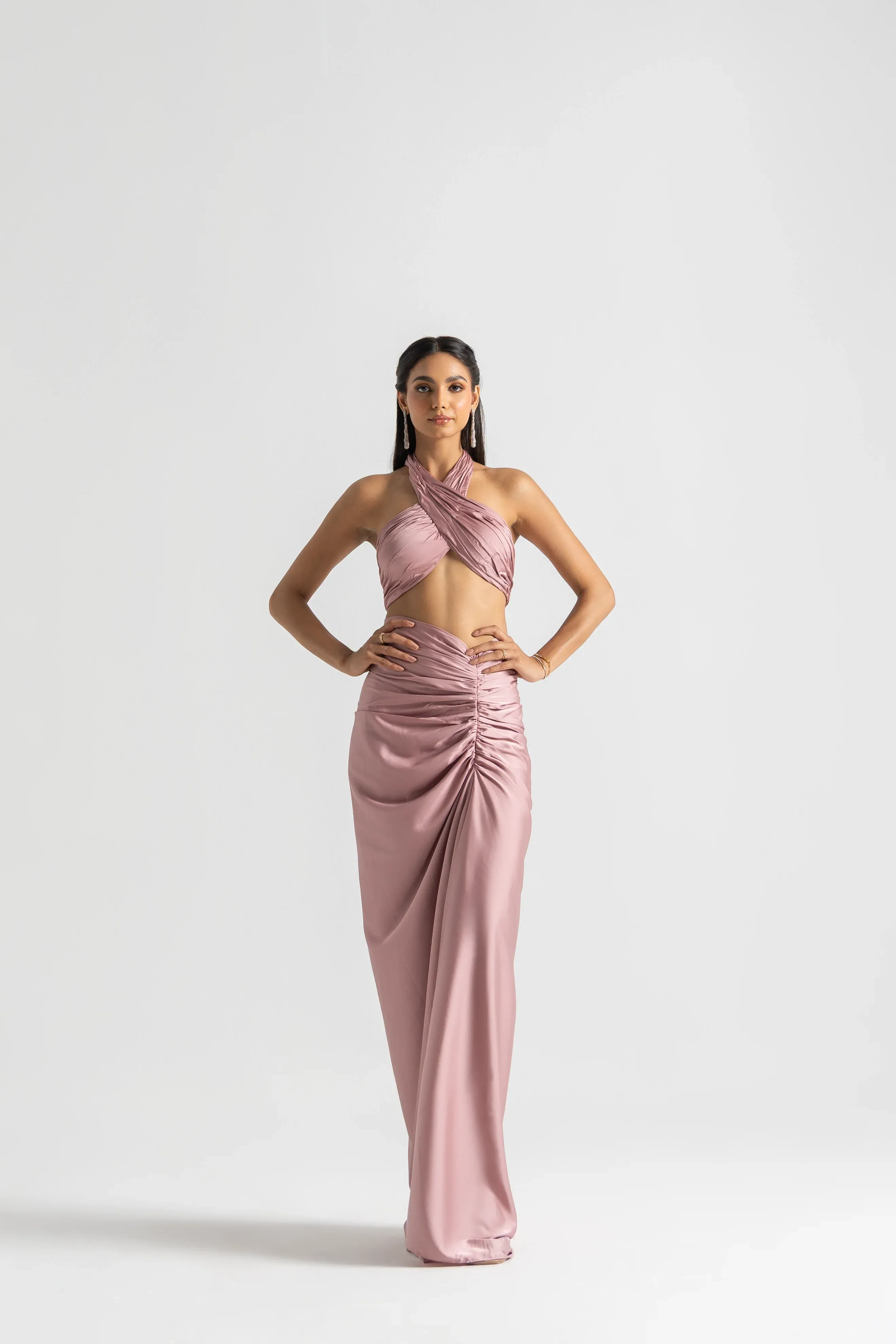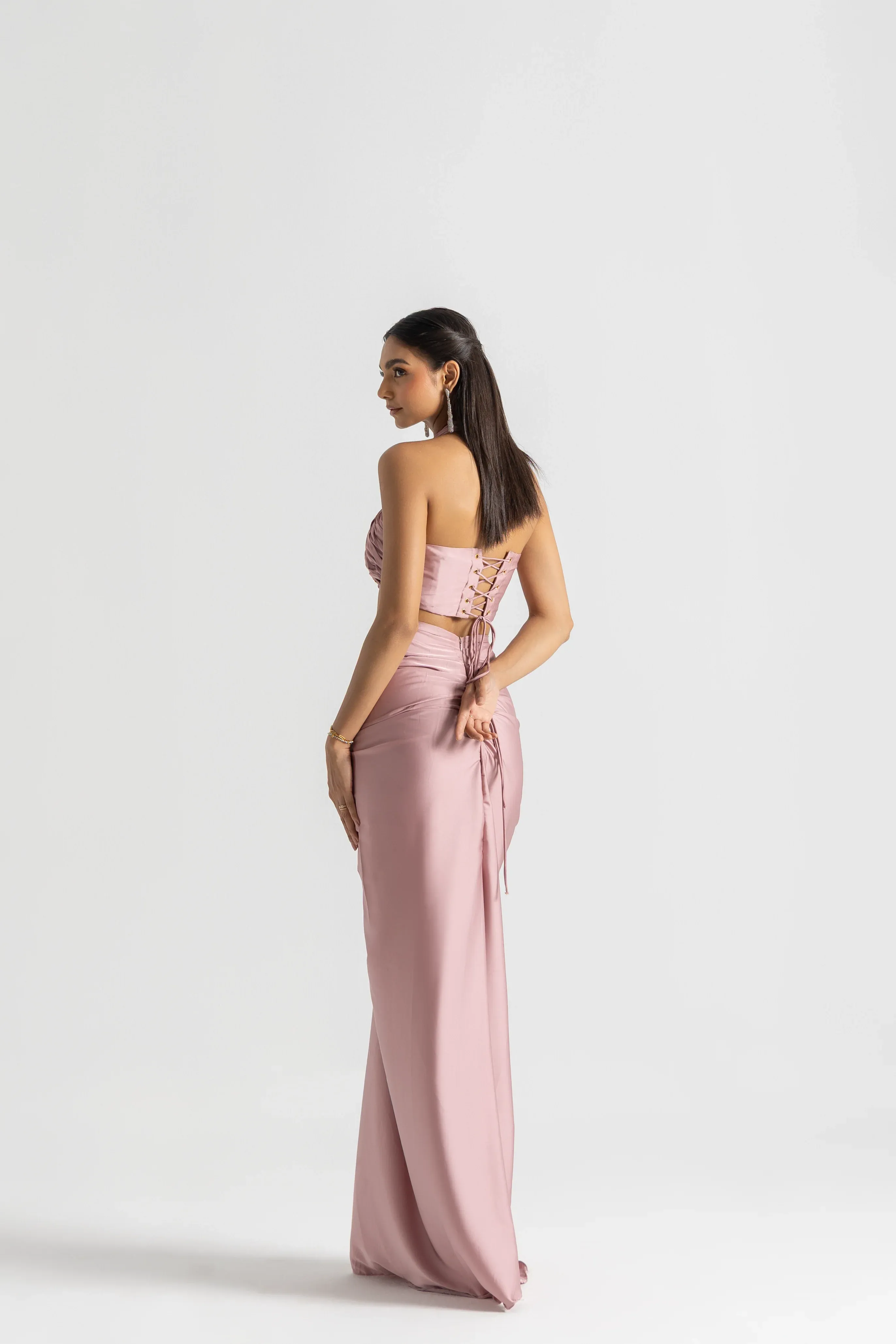 Three-piece pre-draped saree set with embroidered pallu and bustier.