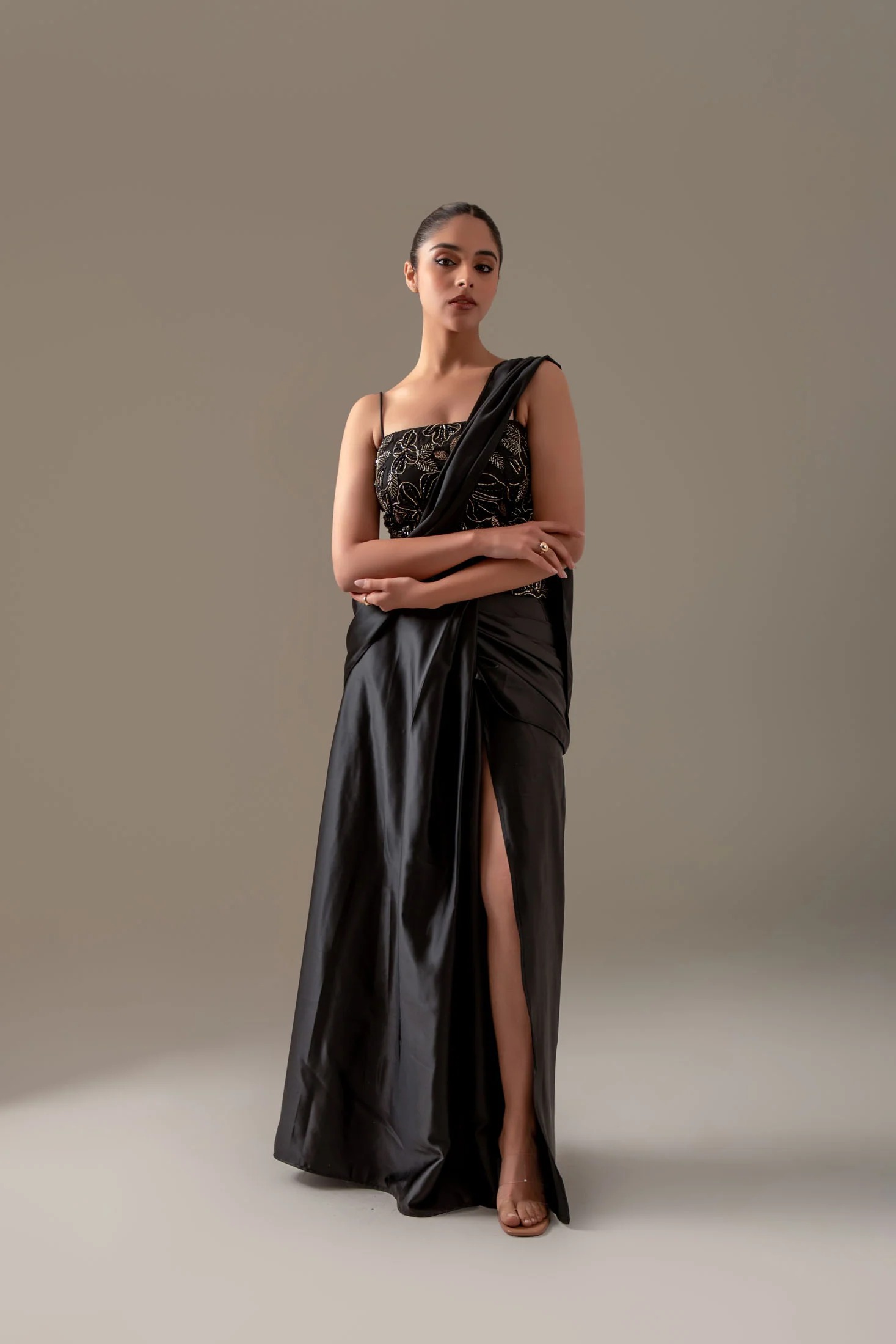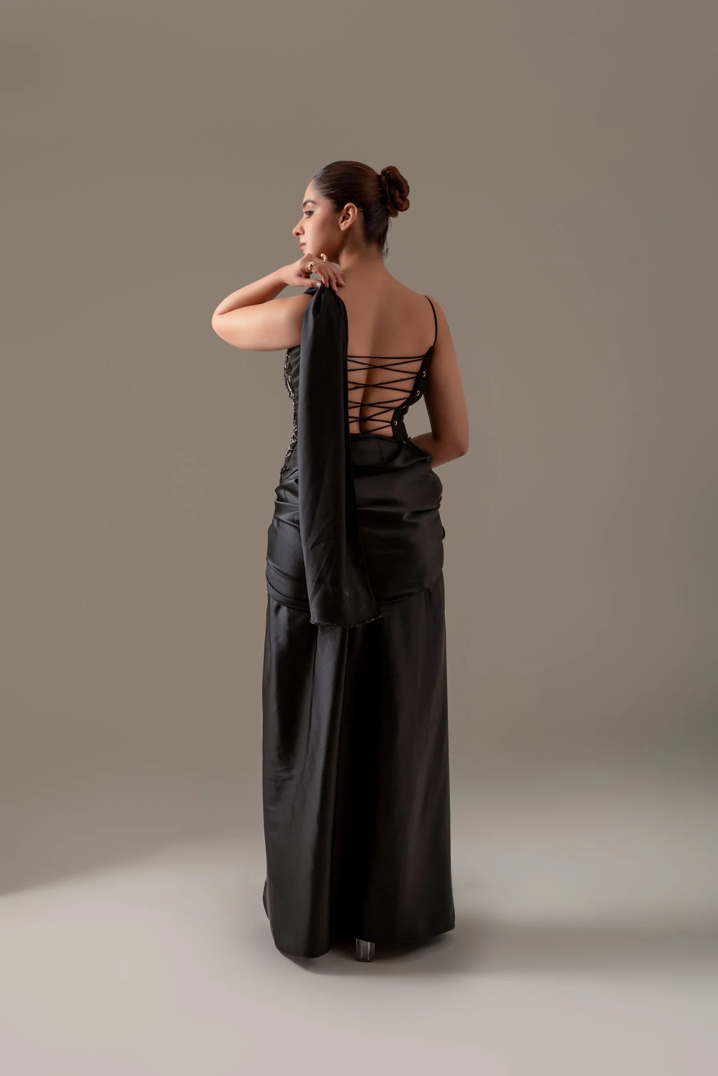 Backless embroidered net corset with satin skirt saree and draped pallu.
