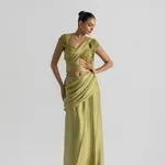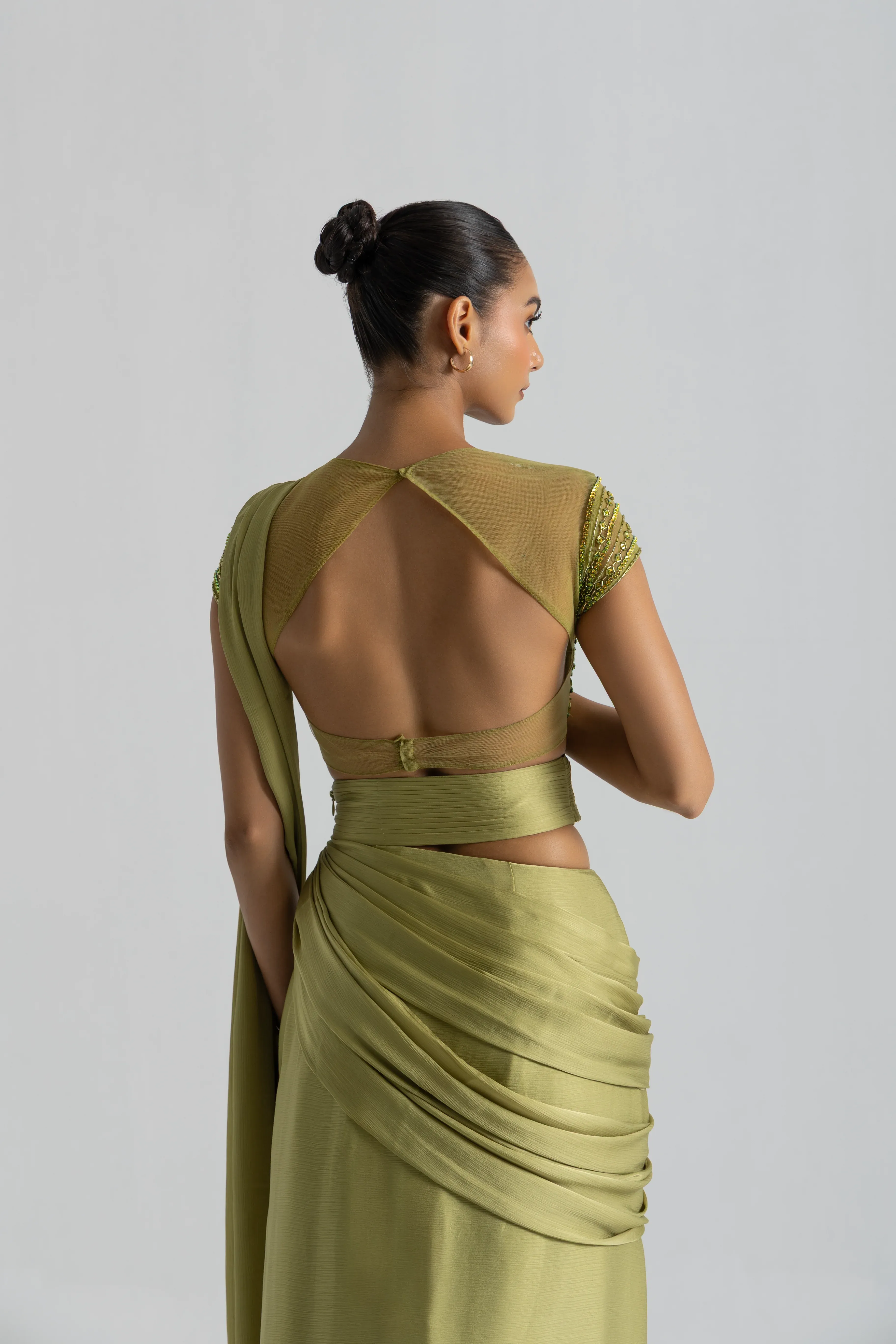 Pre-draped satin silk saree with padded blouse; structured pleats.