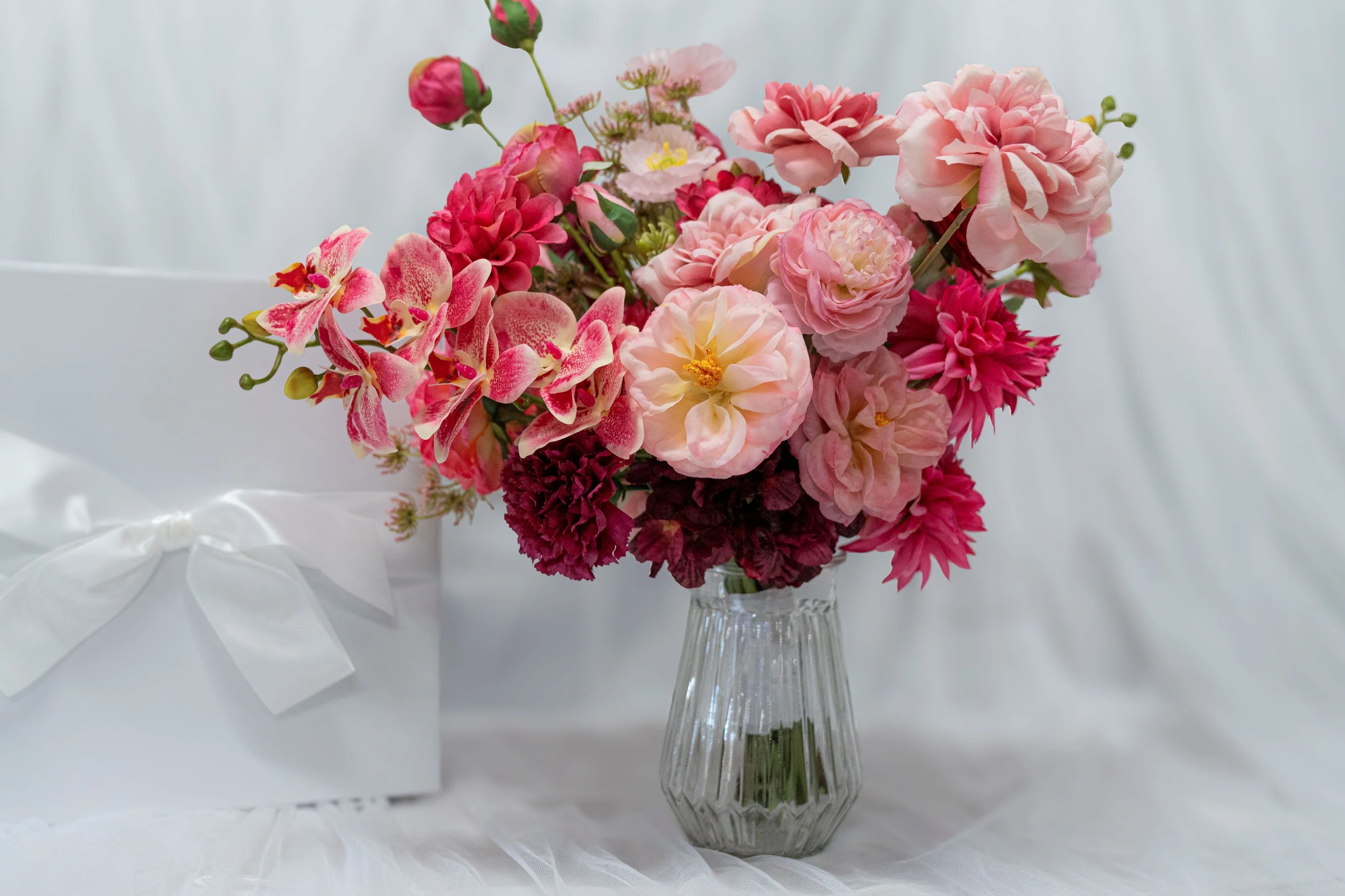 Soft blush and hot pink silk blooms with a buttonhole. Balances delicate romance with bold colour for a standout bouquet.